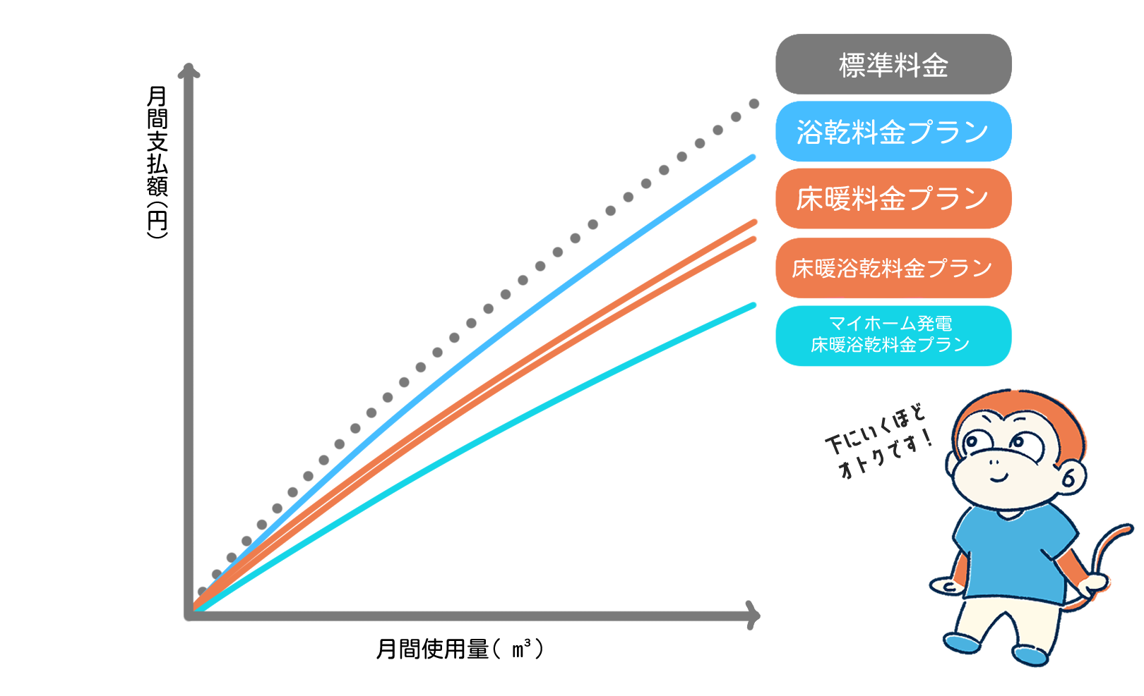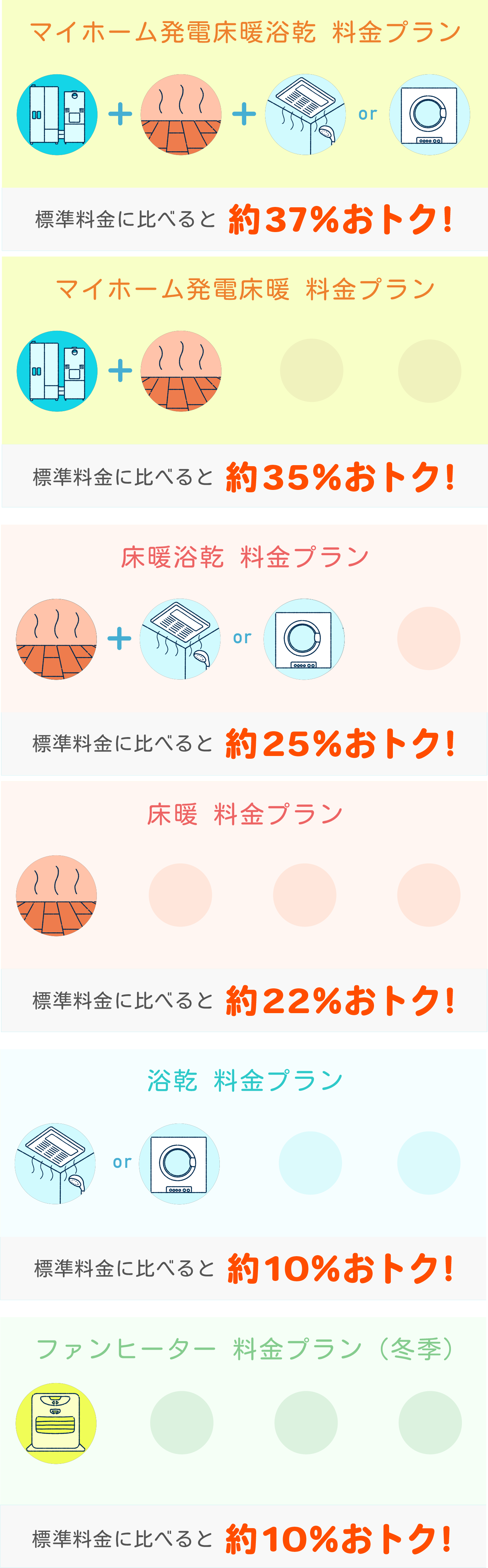 戸建て住宅や分譲集合住宅のお客さま宅に設置されたガス機器に合わせ、標準料金よりもおトクな料金メニューを豊富にご用意しております。