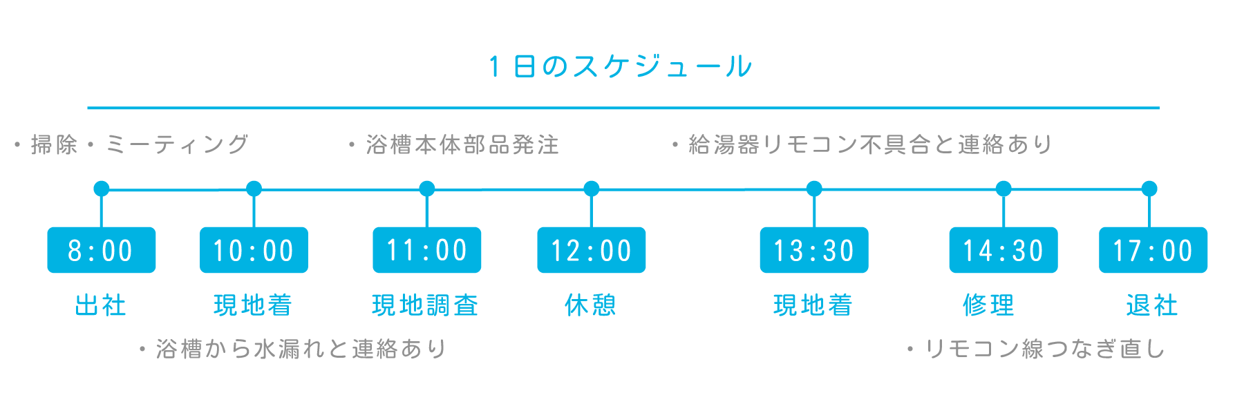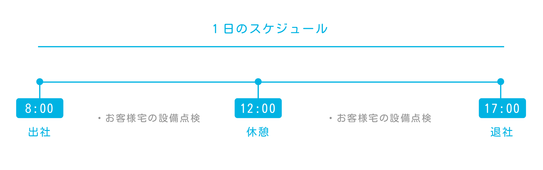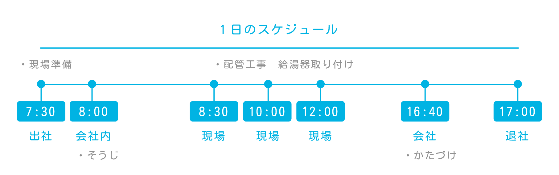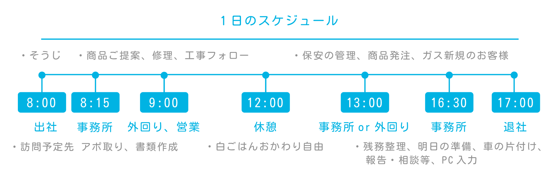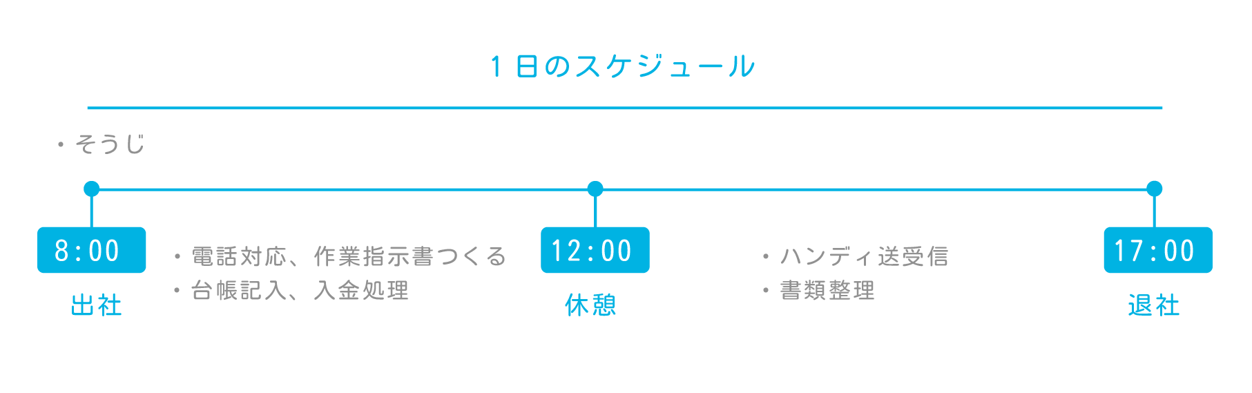 | 勤務時間 | <就業時間> 8:00~17:00 60分のお昼休憩 あり <時間外労働> あり 月平均時間外労働 10時間 |